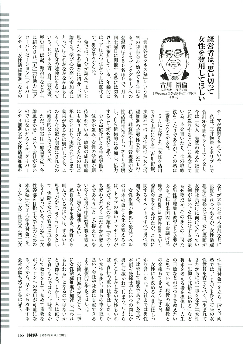 5月に上梓(じょうし)した『女性を活用できる上司になる(古川裕倫、扶桑社)』は、男性向けに女性活躍推進の重要性を訴えたもの。私は、経営陣や中間管理職が女性活躍推進をしっかりと理解し、自ら積極的に参加し、協力することが必要だと思う。